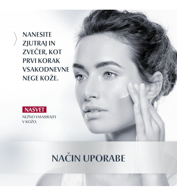 Izdelek vsak dan nanesite kot prvi korak v svoji jutranji in večerni negi in ga nežno vmasirajte v dobro očiščeno kožo. Ne uporabljajte ga na predelu okrog oči.