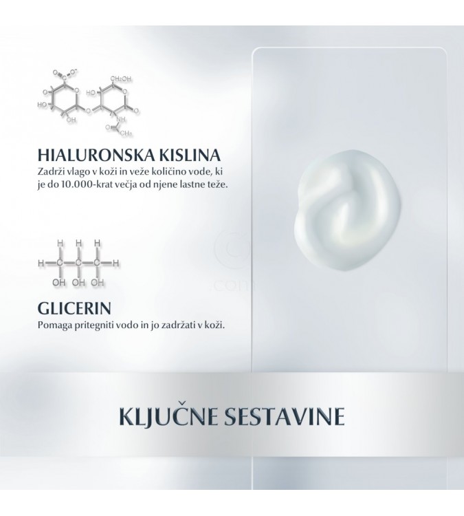 Eucerin Hyaluron-Filler Ultra Light vlažilni booster izjemno lahek in osvežujoč gel zagotavlja takojšnjo navlažitev in izboljša raven vlage v koži za do 24 ur. Formula, ki vsebuje samo 11 sestavin, združuje dve visoko koncentrirani vrsti hialuronske kisline in glicerin. Te sestavine naravno tvori tudi koža, da ohranja svojo navlaženost. Kot del naše formule delujejo kot magneti za vlago, da napnejo kožo s takojšnjo in intenzivno vlago.