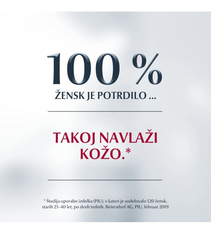 Eucerin Hyaluron-Filler vlažilni booster klinično in dermatološko potrjeno zagotavlja odlične rezultate. 100 odstotkov sodelujočih v raziskavi se je strinjalo, da je izdelek kožo oskrbel z »dodatno vlago«, poskrbel za občutek »takojšnje navlaženosti« in »vidno bolj napet« videz.1