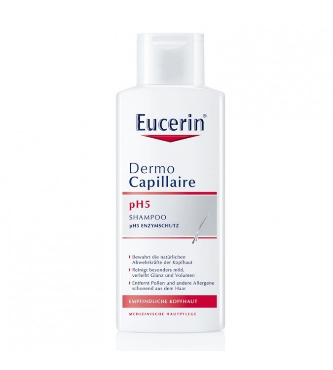 Eucerin DermoCapillaire pH5 šampon je primeren za vsakodnevno umivanje las pri občutljivem lasišču. Čisti posebej blago, lasem podari volumen in sijaj ter z njih nežno odstrani cvetni prah in druge alergene. Formulo šampona, ki ne vsebuje alkalnih mil in je obogatena z dekspantenolom, koža izjemno dobro prenaša. pH5 citratni pufer stabilizira koži lastno pH-vrednost.
