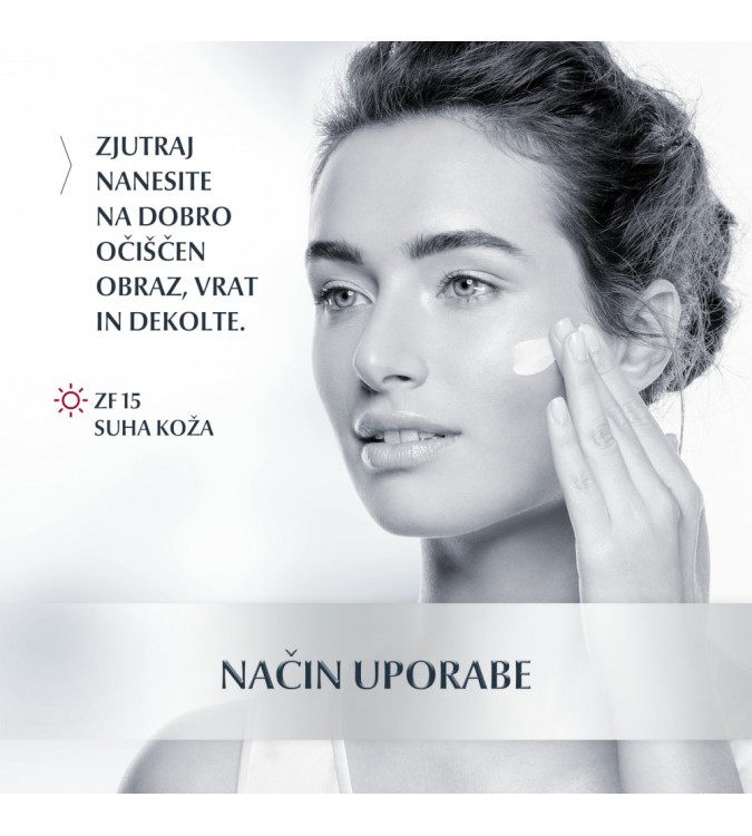 Nanesite zjutraj na dobro očiščeno kožo obraza, vratu in dekolteja ter nežno vmasirajte v kožo. Svilnato gladka krema napravi kožo na otip prijetno svilnato.