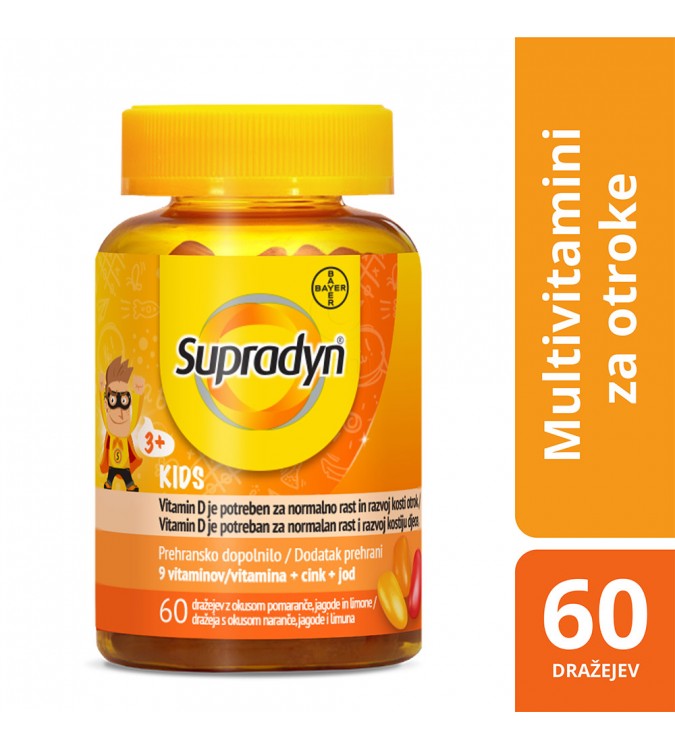 Multivitaminski dražeji Supradyn Kids so namenjeni vzpostavljanju in vzdrževanju dnevnega nivoja multivitaminov potrebnih za rast in razvoj otroka med 3. in 17. letom.
