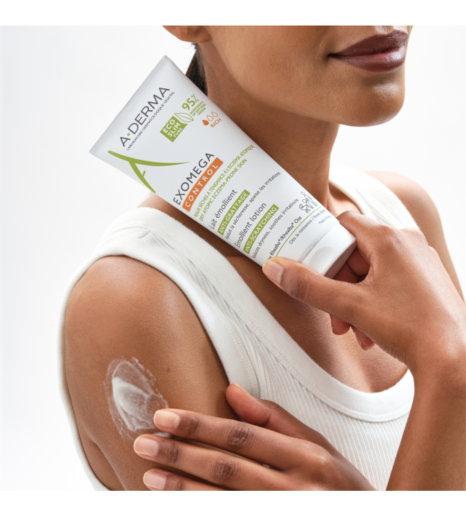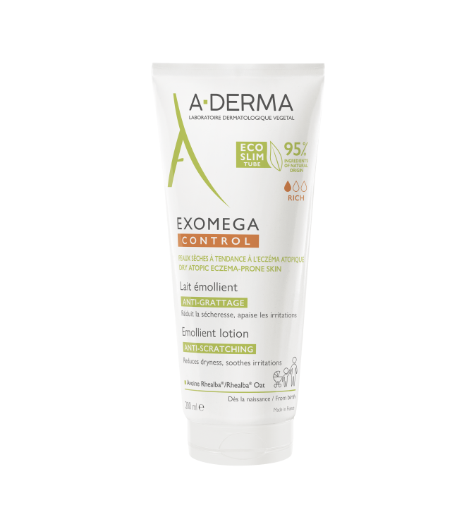 A-DERMA EXOMEGA CONTROL emolientni losjon z ekstraktom iz poganjkov Rhealba® ovsa za suho kožo nagnjeno k atopijskemu dermatitisu. Preprečuje praskanje. Nemudoma pomiri kožo in uravnava občutek razdraženosti zaradi suhosti kože.