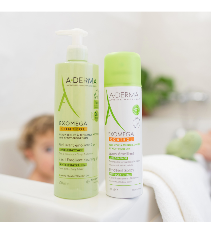 A-DERMA EXOMEGA CONTROL emolientni čistilni gel 2v1, nežno čisti zelo suho kožo in kožo nagnjeno k atopijskemu dermatitisu (dojenčki, otroci in odrasli). Pomirja, vlaži in ščiti pred izsušitvijo. Spoštuje naravne obrambne mehanizme kože, Fiziološki pH.