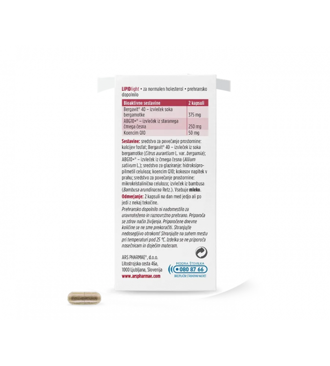 LIPIDlight® s svojo edinstveno kombinacijo dveh naravnih patentiranih izvlečkov ABG10+® (staran črni česen (Allium sativum L.)) ter Bergavit® 40 (citrus bergamotka (Citrus aurantium L. var. bergamia)) in koencimom Q10 na naraven način: