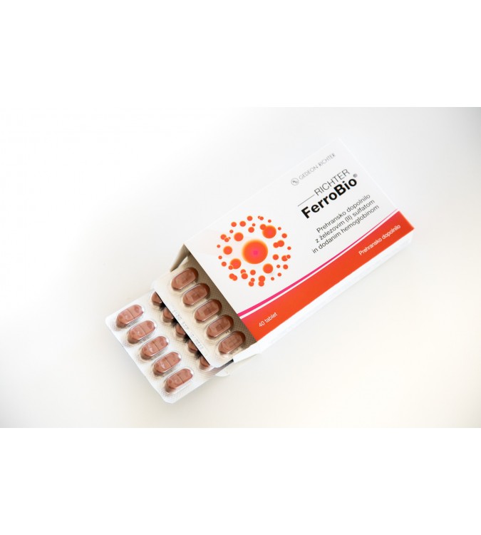 RICHTER FerroBio je prehransko dopolnilo, ki vsebuje železo v obliki železovega (II) sulfata z dodanim hemskim železom, kar omogoča optimalno biološko uporabnost in izjemno dobro prenosljivost. Na absorpcijo ne vplivajo ne želodčna kislost ne hrana ali pijača.