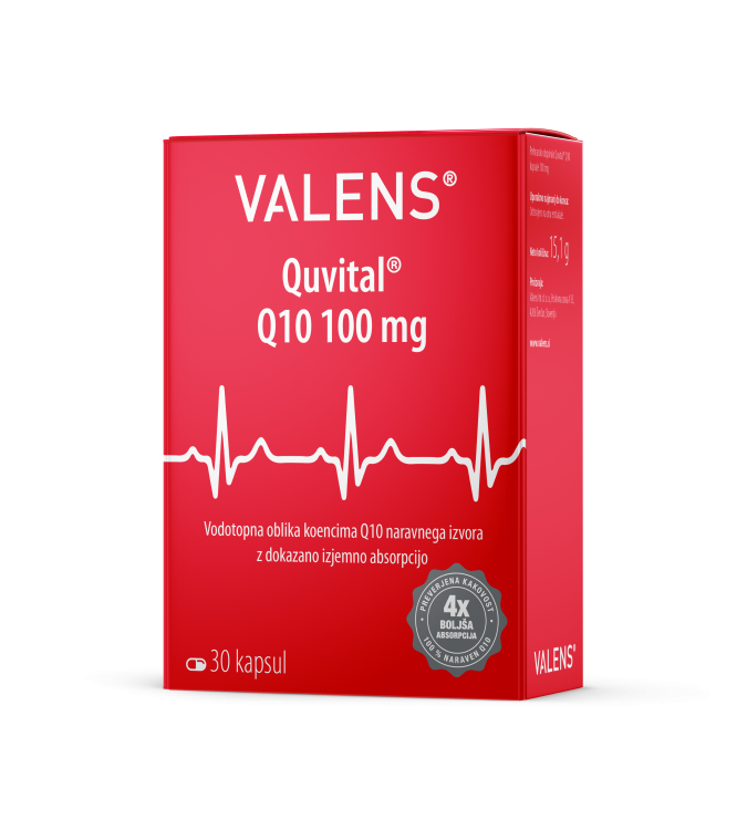 Quvital® Q10 kapsule 100 mg vsebujejo 100 mg aktivne vodotopne oblike koencima Q10 (Q10Vital®), s klinično dokazano izjemno absorpcijo. Izdelano v Sloveniji. Primerno za vegane.